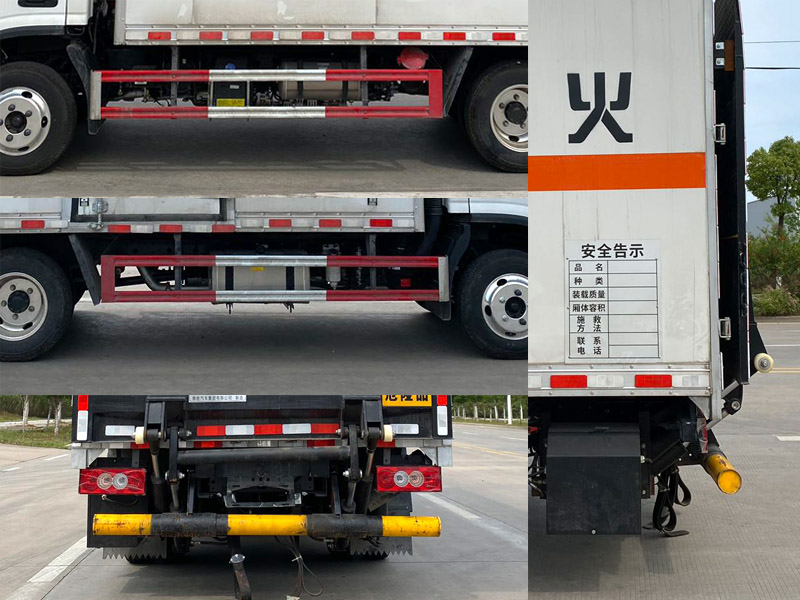 | 其它: | 1、該車為危險品運輸車,運輸具有獨立容器(瓶)包裝的物品,運送危險物品類項號:9。廂體頂部封閉,不可開啟。2、側、后防護材料均為Q235,螺栓連接,后防護截面尺寸(mm)Φ100,下邊緣離地高390mm。選裝后部無尾板時,后防護材料為Q235,螺栓連接,截面尺寸(mm)120×60,下邊緣離地高400mm。尾板收起狀態水平長度為280mm,尾板質量為350kg。3、整備質量含備胎,滅火器及隨車工具;貨廂重量為1050kg;材質/厚度:復合板結構廂體:底板材質為Q235,厚度4mm,側板為外Q235+中間阻燃泡沫+內純鋁板,厚度42mm;瓦楞板結構廂體:底板材質為Q235,厚度4mm,側板為Q235,厚度1.5mm。4、僅選用排氣管前置、限速裝置(限速80km/h)、前輪盤式制動及子午線輪胎的底盤,轉向輪安裝輪胎爆胎應急防護裝置。安裝帶有衛星定位功能的行駛記錄儀。ABS系統控制器型號/生產企業: :YF8/武漢元豐汽車電控系統有限公司,ABS-E/威伯科汽車控制系統(中國)有限公司,ABS-VI·E/廣州瑞立科密汽車電子股份有限公司,YF9/武漢元豐汽車電控系統有限公司。發動機/油耗值(L/100km)對應關系為: D20TCIF2/11.22,D25TCIF1/11.16, D20TCIF1/11.22。僅選用3360mm軸距,選裝ETC。廂體側面選裝開門型式及位置,選裝不帶側開門,選裝瓦楞板結構;廂體前后及側面選裝開百葉窗,選裝后尾板樣式,選裝無后尾板。 |